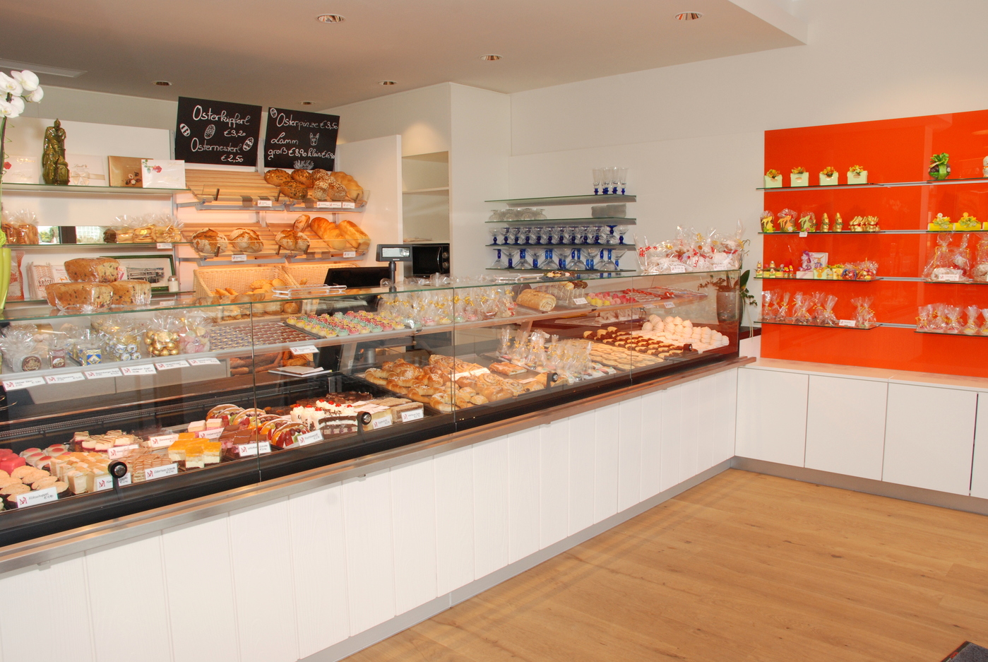 Hier verwöhnen wir Sie im klassisch-modernen Ambieten mit hausgemachten Mehlspeisen und kleinen Imbissen. Im Sommer lädt der großzügige Außenbereich zum Kaffeetrinken und Eis gustieren ein.